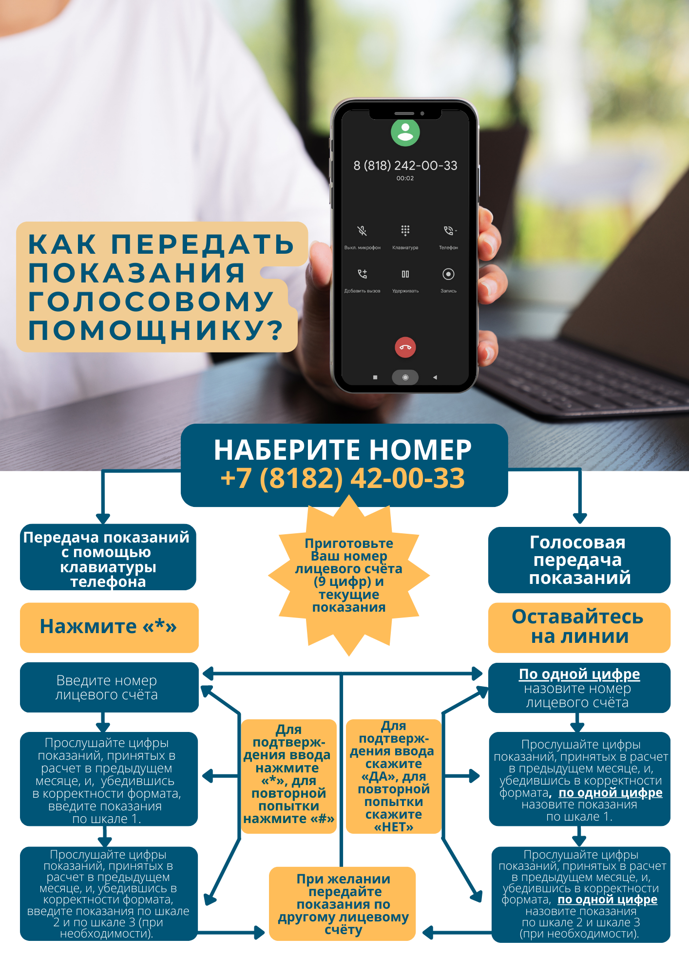 Для передачи показаний потребителю следует позвонить по многоканальному номеру 8 (8182) 42-00-33 и придерживаться пошаговой инструкции голосового помощника